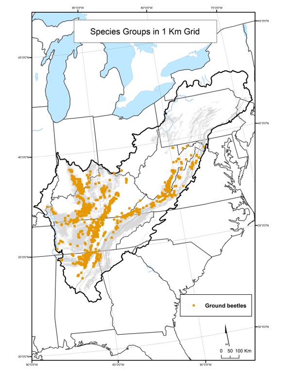 Since there were too many species (710) or even genera (131) to analyze within the scope of this project, a functional ecological approach was utilized. The ranges of nine ecological groups were analyzed, including; predaceous ground beetles, millipedes, pseudoscorpions, springtails, spiders, amphipods, isopods (Asellidae), crayfish, and fish. Collectively, they are the best studied and most abundant stygobionts and troglobionts. Species within each group have very similar ecological roles, so interesting generalities should emerge about the conditions under which they are found. The number of species in each group ranges from 164 (beetles) to four (fish).