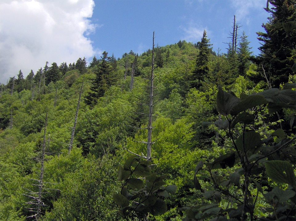 Mixed spruce-fir and northern hardwood forest on the upper western slope of Waterrock Knob (el. 6,292ft/1,918m) in the Plott Balsams of Western North Carolina, USA. This view is from a cliff just off the Waterrock Knob Trail. The dead trees are Fraser firs killed by the balsam woolly adelgid.