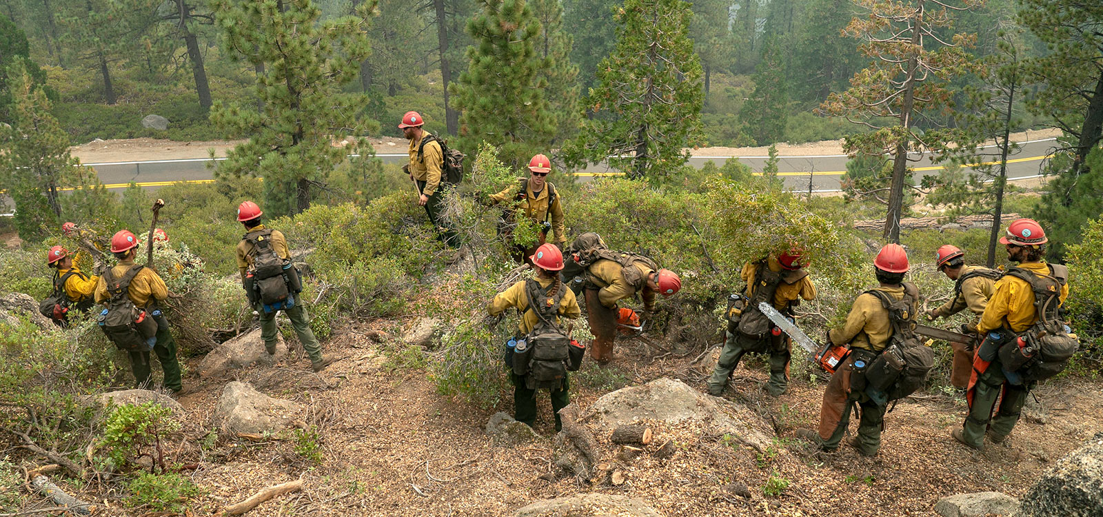 Firefighters with Stanislaus Hot Shot Crew clear out vegetation to mitigate fire progression at the Donnell Fire, Stanislaus National Forest, California. (Forest Service by Cecilio Ricardo).