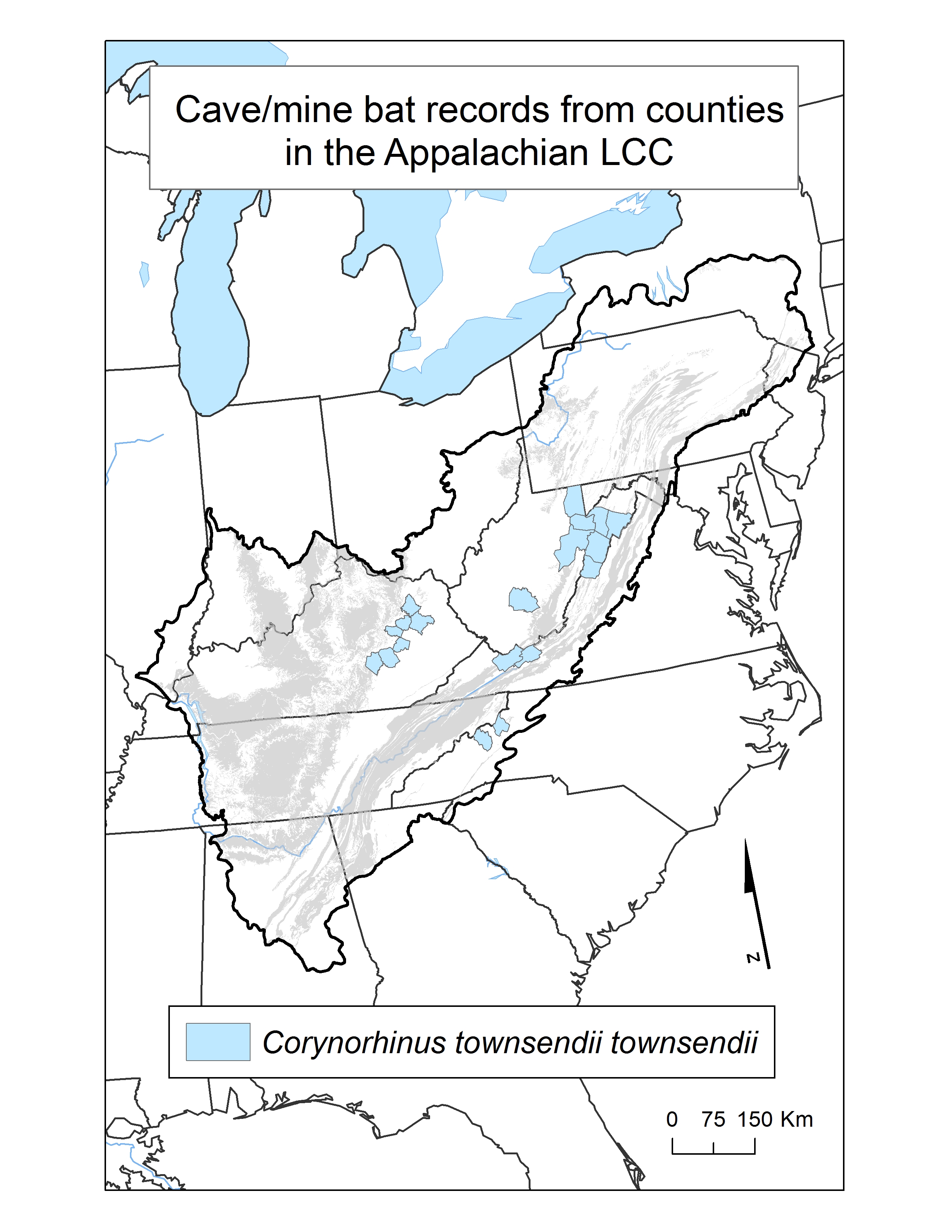 Distribution map of counties with an occurrence for Virginia Big-eared Bat (Corynorhinus townsendii virginianus) within the Appalachian LCC region.