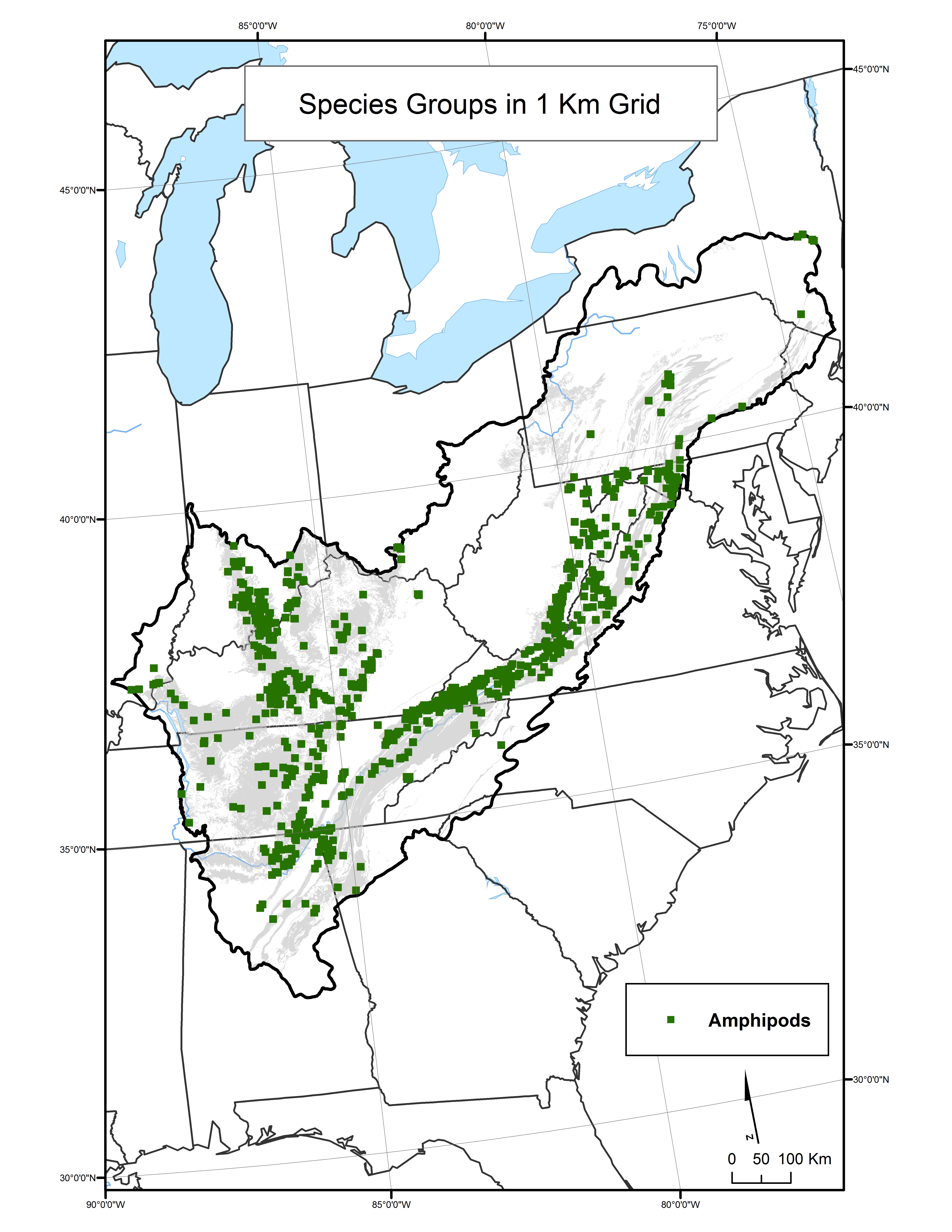 Distribution of the amphipod species group by 1 kilometer grids throughout the Appalachian LCC region.