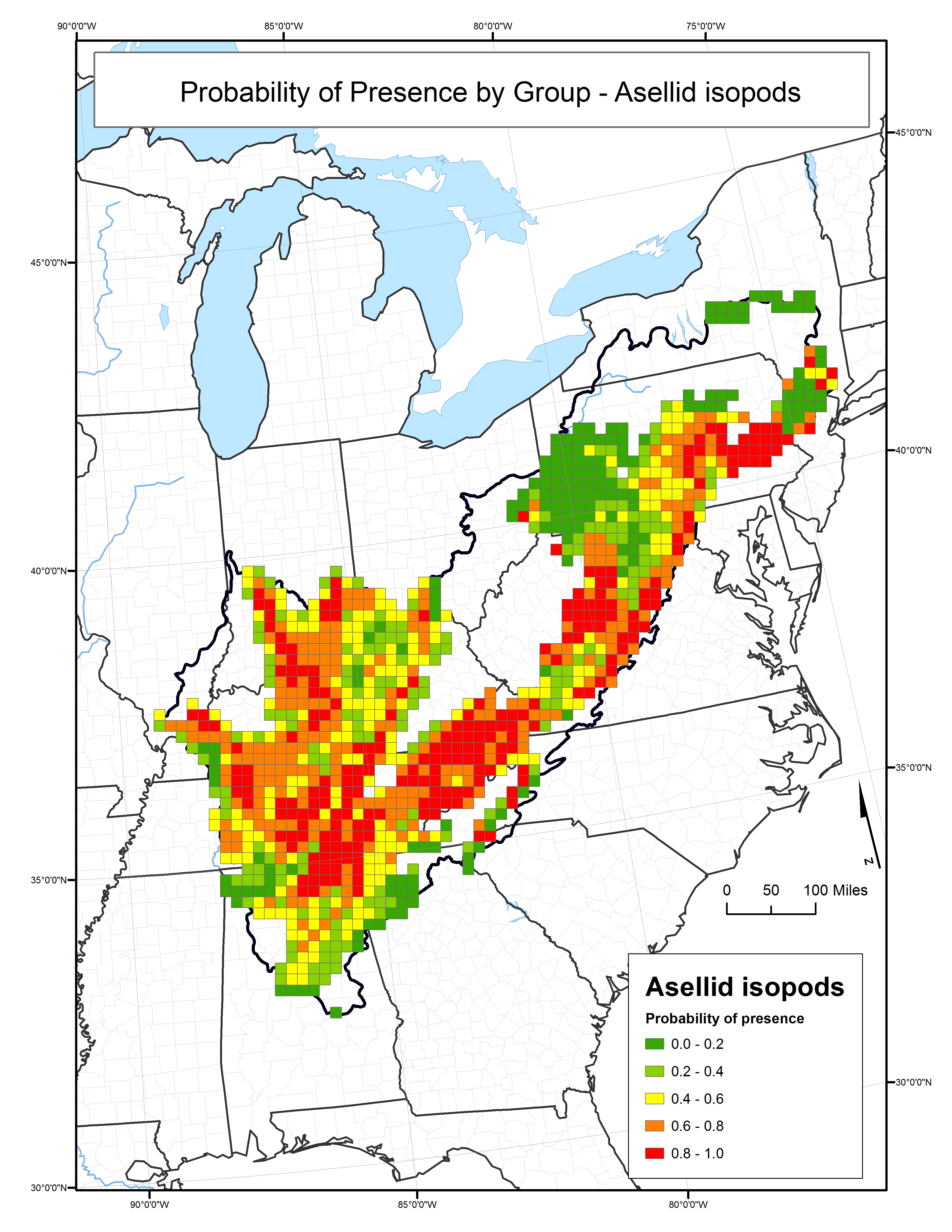 This map depicts the probability of presence for species within the asellid isopod group throughout the Appalachian LCC region. Red areas have the highest probability of presence.