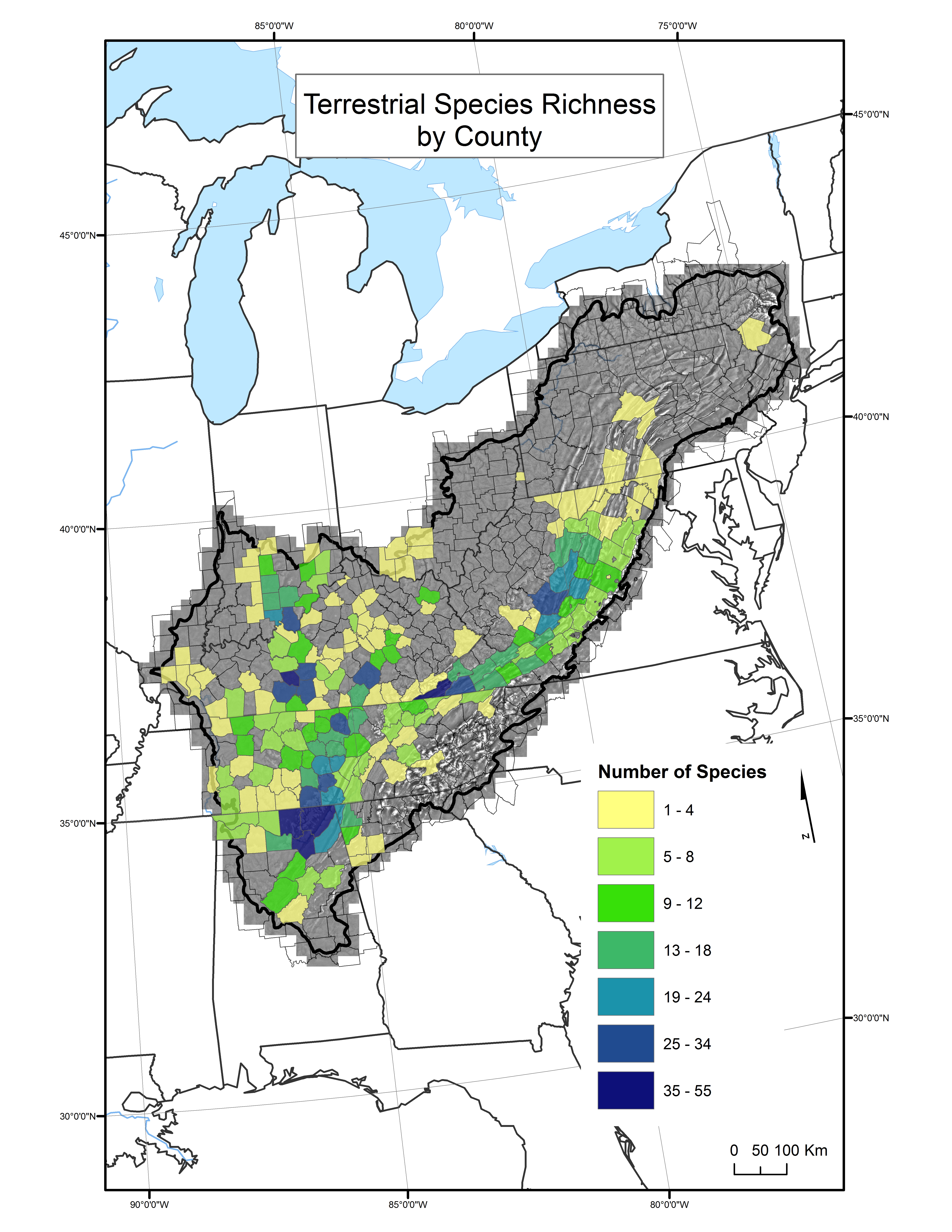 Distribution of terrestrial species richness at the county scale throughout the Appalachian LCC region.